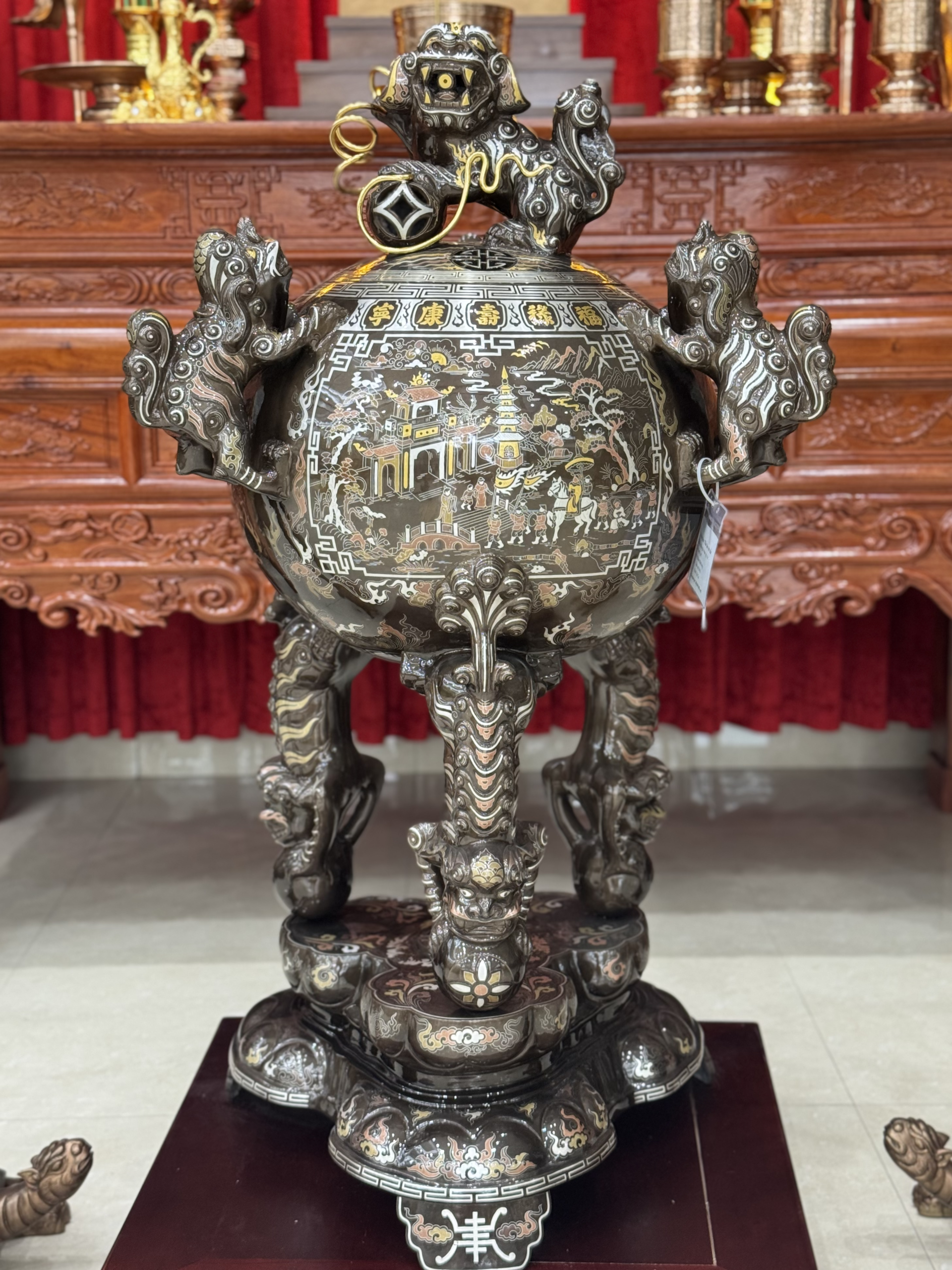 Đỉnh có form tròn lớn, thế đứng vững chắc, đường khảm Vàng, Bạc... sắc nét trên nền màu đồng đỏ hạ tông trầm sang trọng – giúp không gian thờ trở nên bề thế, linh thiêng và phong thủy tốt.